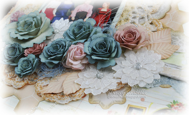 Lace Edge ~ I pulled the paper back in a couple spots and tucked in some Prima lace from my stash and adorned with the Kaisercraft kit pearls.