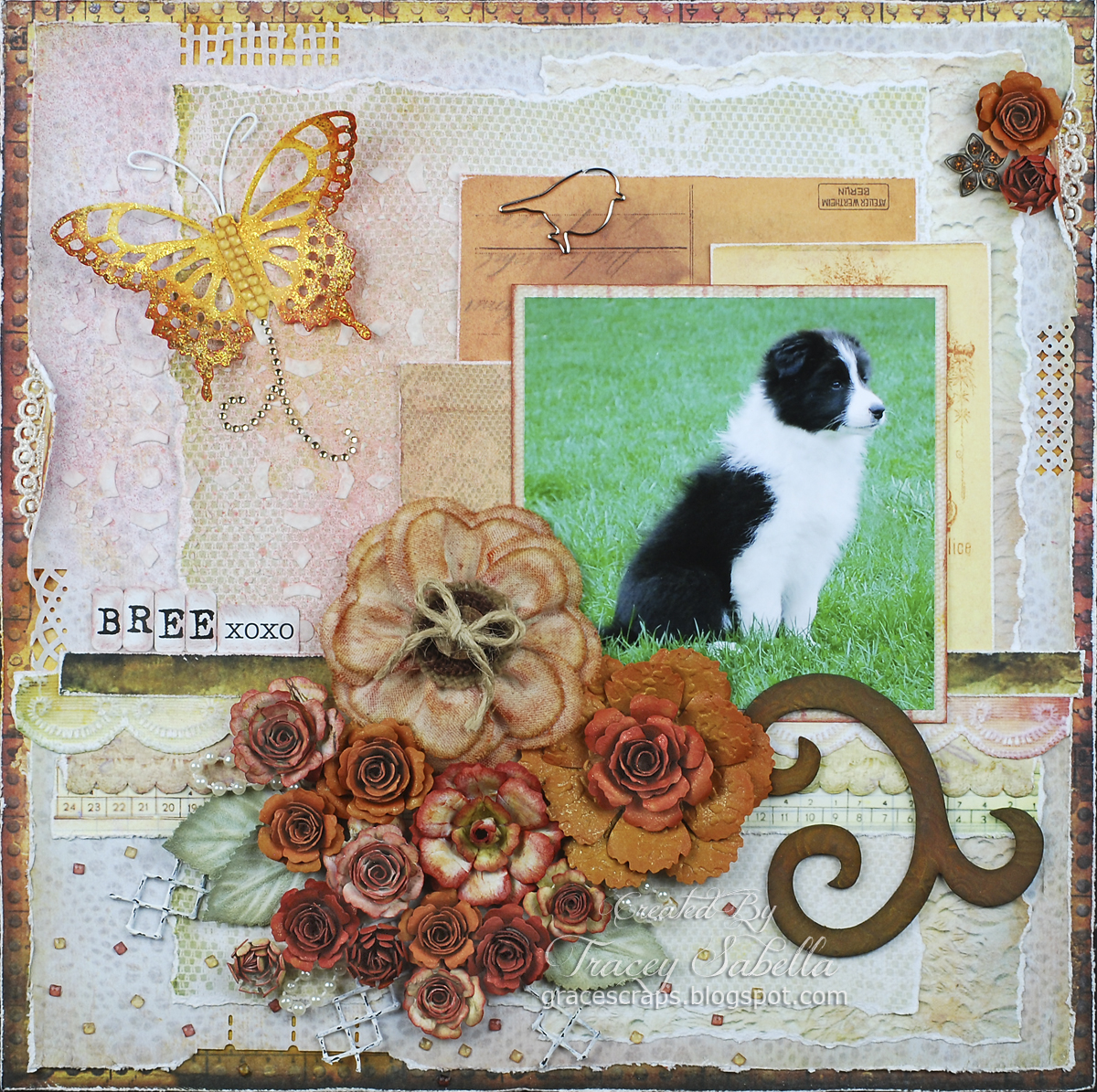 the pup is tooooo cute for words! love your lo, tracey. that cluster is superb, as well as the details on your butterfly and flourish!