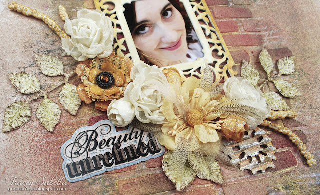 This focal flower was hand crafted with petals cut from Grand Peony and Carnation Creations dies. The petals were dampened, scrunched and misted to achieve this texture and color. The shell button is from my vintage button collection. I also keep my eye open in the jewelry department and grab jewelry findings that have been clearanced. The crystal flower and art deco piece are some that I've found.