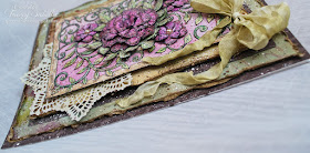 The lace on the edge of the card is adhered using Helmar Fabric Glue. Because this lace is sheer in places and the glue would show through, I applied the adhesive just to the lace edge that is tucked under the frame/flower layer.
