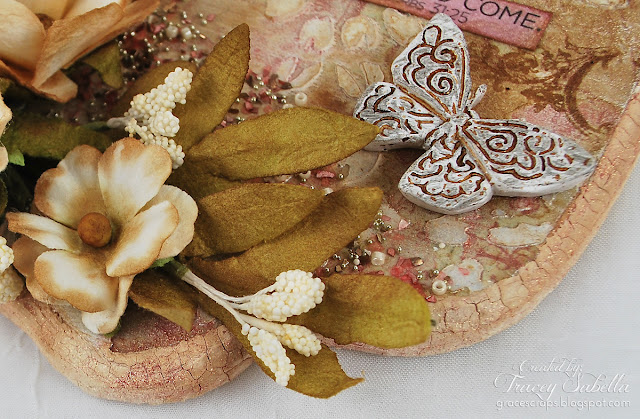 As soon as I saw the gorgeous Patricia's Memoirs Scraps of Elegance July Kit, I knew I would pair the sweet Prima Resin flower with the wood plaque for a Scripture art home decor piece. I adore the vintage combination of rose and brown, so I colored the background and kit elements with a dark golden brown to complement the lovely rose paper and coral glitter.
