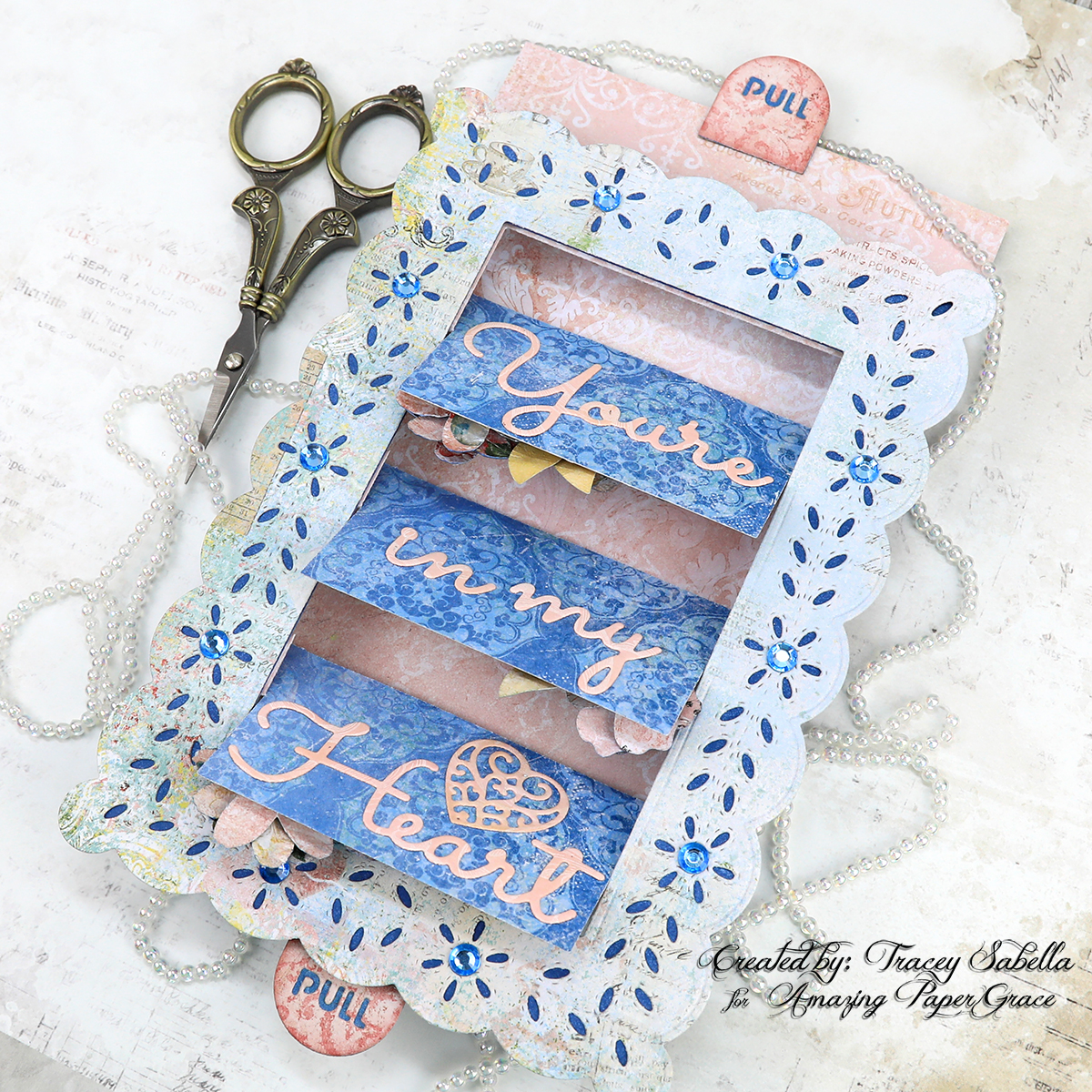 I've really enjoyed creating these interactive cards featuring the Amazing Paper Grace Garden Shutters Collection. This sweet valentine features the Eyelet Frame set (S6-184) which pairs perfectly with the Butterfly Bliss Garden Shutters 5x7 Card Base (S6-183). I've also used the heart element, pull tab and sentiment from the Primrose Heart Façade Garden Shutters set (S5-484). The flowers are cut from the Cinch and Go Blossoms die set (S4-1163) from the newly released Classically Becca Collection.