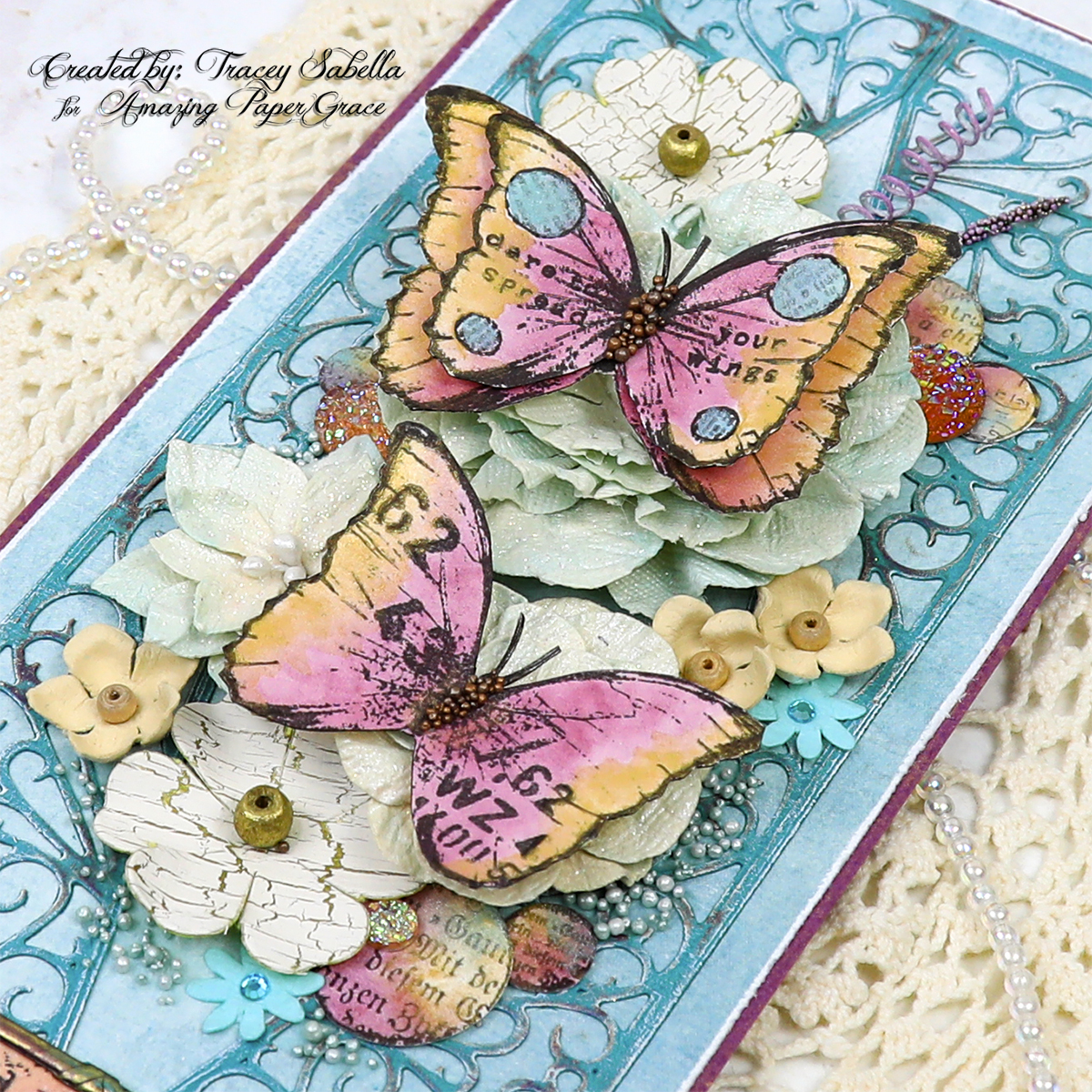 Summer has arrived here in Ohio bringing soaring temperatures and gorgeous fluttering butterflies. The scrolled design in this fabulous Amazing Paper Grace Half Slimline Diamond set (S4-1197) looks like iron scrollwork to me and I just couldn't resist this using amazing design as a backdrop to these watercolor butterflies layered over beautiful flowers.